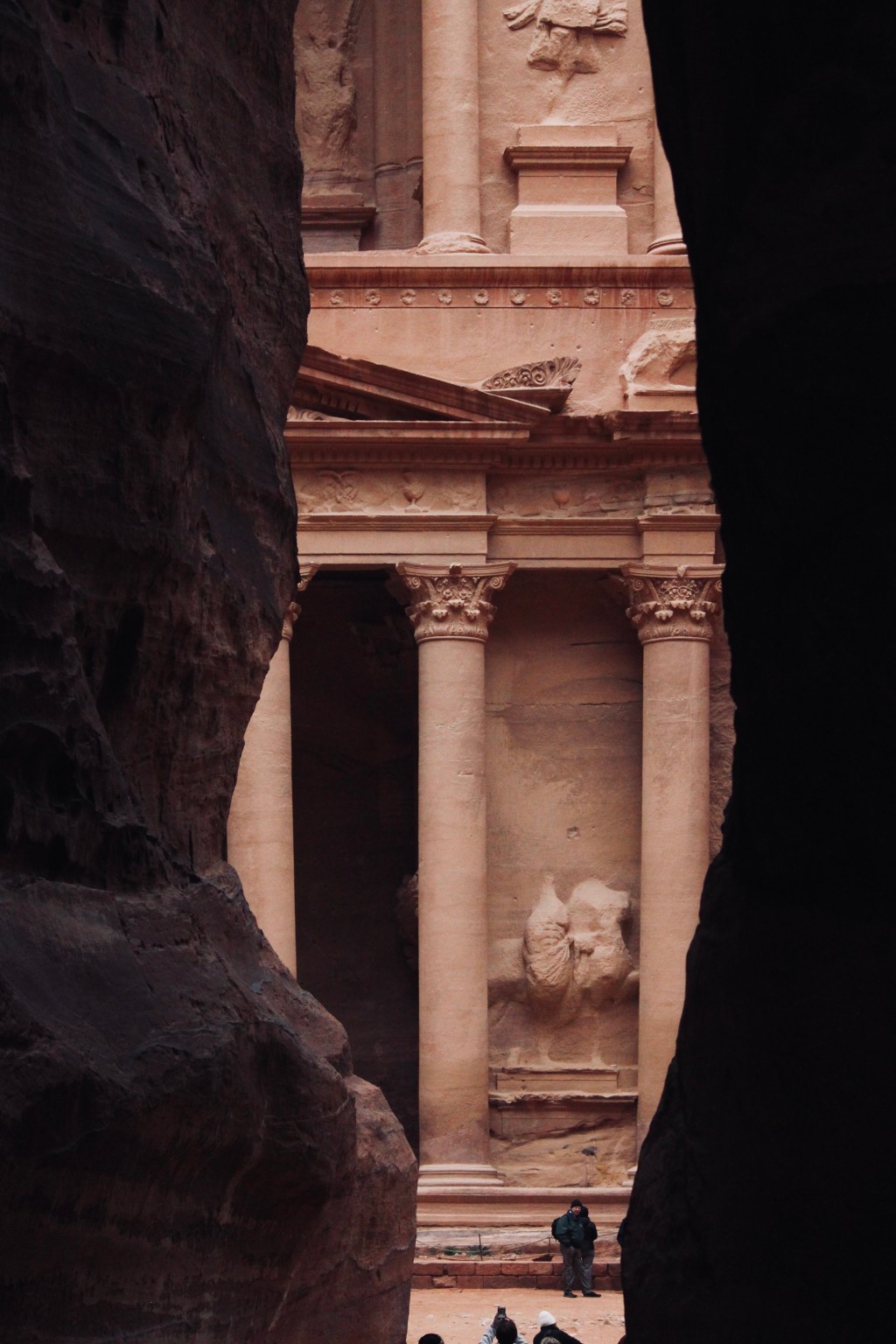 The view from up here offers something different. The treasury building is distant enough that your eyes can fit its frame within the boundaries of your perception, and I see just how sunk into the rock face it is. It’s almost absurd, a pinkish façade inlaid like intaglio into that bedrock. It must have been pitch black inside, the only entrance way for life and light, that one pinhole doorway far off below. There comes a time, with all views like this, where you know you can sit for hours, drinking it in. Tracing the contours of that face and try to unearth its secrets. But life is rarely so gifting and there are already people hovering about, on the fringes of the ledge, wanting to sit where I am. I sit in a moment of peaceful exploration, but lingering on the precipice, upon the fringes, the world marches on. And so I have to forsake my spot, the view, to the next eager individual as I stand and pass them. Just like that only moment later, I am down the bottom again. The end of the journey, a feeling of dissatisfaction with all that I missed and I understand that this is a foretaste of death.